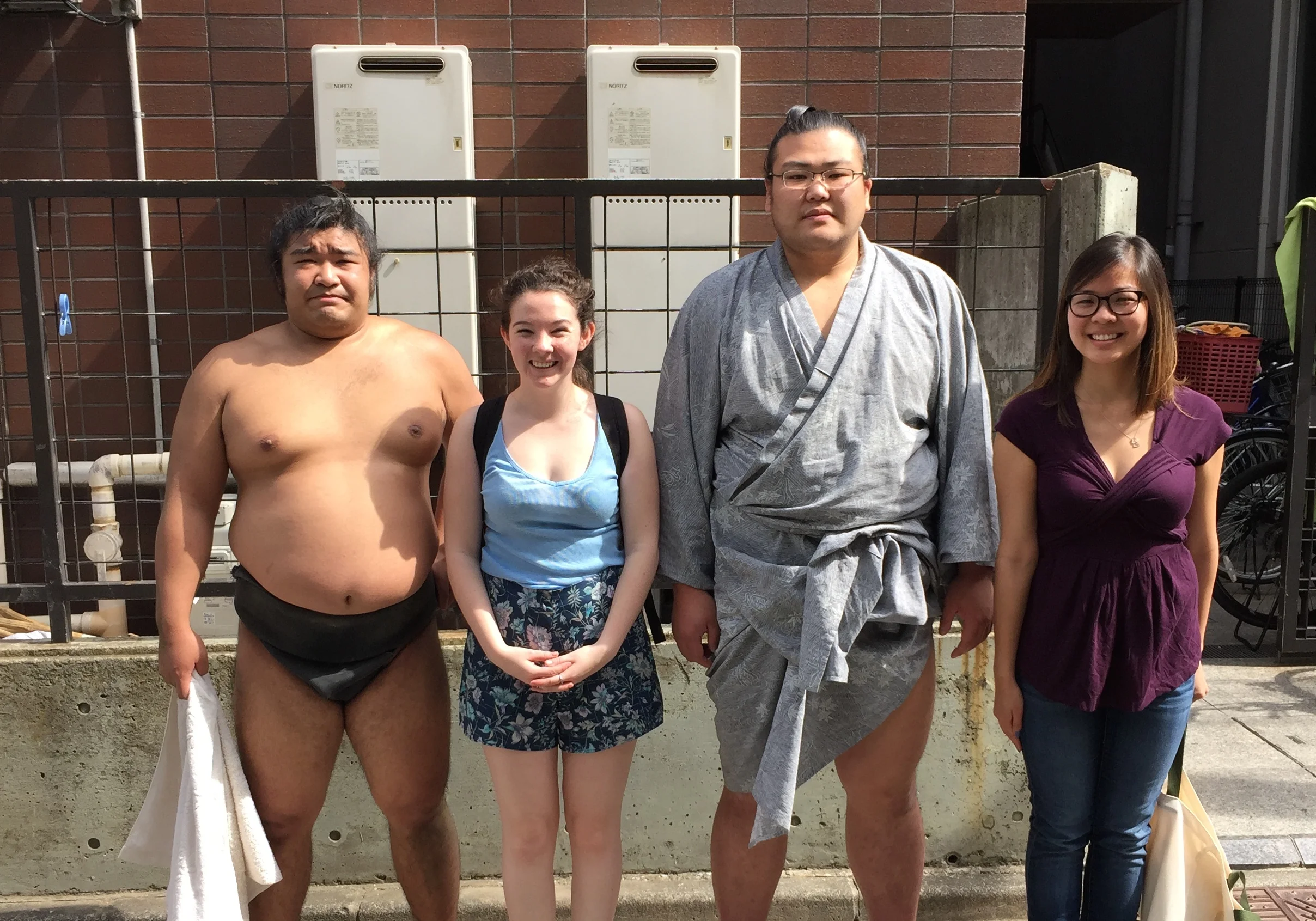 I made a new friend during my hostel stay! Meet Chloe pictured below. Alex had already gone to her next destination in Japan, and I needed an extension in my hostel. I opted for the 12 shared female dorm. Chloe was my bunk mate, and she's from New England. She's super rad, and was totally down to go see a Sumo, and eat raw fish with me. Even if she didn't like sushi or she thought she didn't. Until she tried Tsujiki fresh sushi!! Unfortunately, the Sumo matches were all out of season when we were there, and we happen to run into these Sumo wrestlers taking a break in the alley. Like creepers we asked for their pictures hoping they wouldn't beat us up.